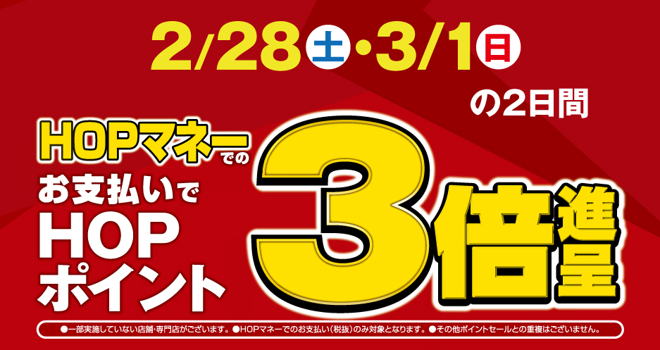 2/28(土)・3/1(日)【エール/専門店/無印良品】HOPマネー払いでポイント3倍!